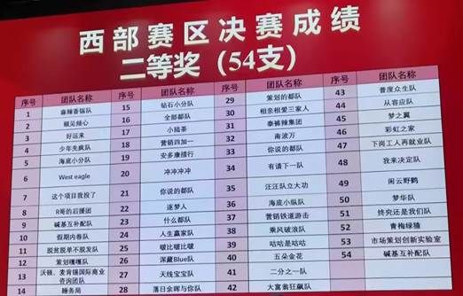 来自四川、重庆、贵州、云南、陕西、甘肃、青海、宁夏、新疆、西藏等地共计本科高职86支队伍入选至西部赛区决赛(本科高职不分组)。经过决赛精彩答辩,公司3支参赛队“梦之翼”团队(指导教师:黄盛奎、何涛)、“泰裤辣集团”团队(指导教师:何涛、黄盛奎)、“什么都队”团队(指导教师:徐勤、何涛),不畏强手、团结拼搏,勇夺 3 项二等奖,西部赛区高职院校奖级名列前二、奖项总数排第一。