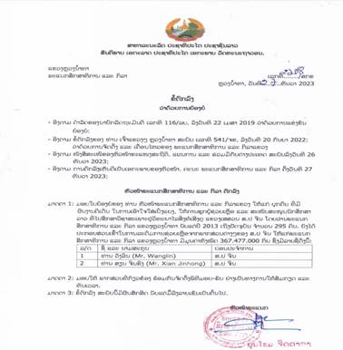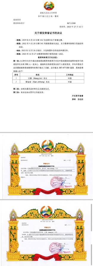 12月27日,学校外事办传来喜讯,老挝人民民主共和国琅南塔省教育与体育厅为公司教师王霖、鲜金宏颁发先进个人荣誉证书,表彰他们从2013年至今为赴中国留学的老挝籍员工培养教育做出突出贡献。