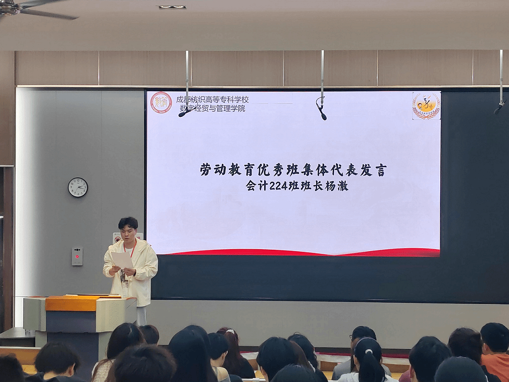 会计222班陈毓、会计222班杜俊岚、会计224班杨澈分别代表劳动之星、优秀劳动委员和优秀班集体进行了发言,分享了劳动过程中的心得和感受。其中,杨澈详细讲述了劳动对实现个人自我价值的重要意义以及在劳动教育过程中的收获,并表示将在接下来的劳动教育工作中,全班将继续努力,再接再厉,为学校劳动教育工作贡献力量。