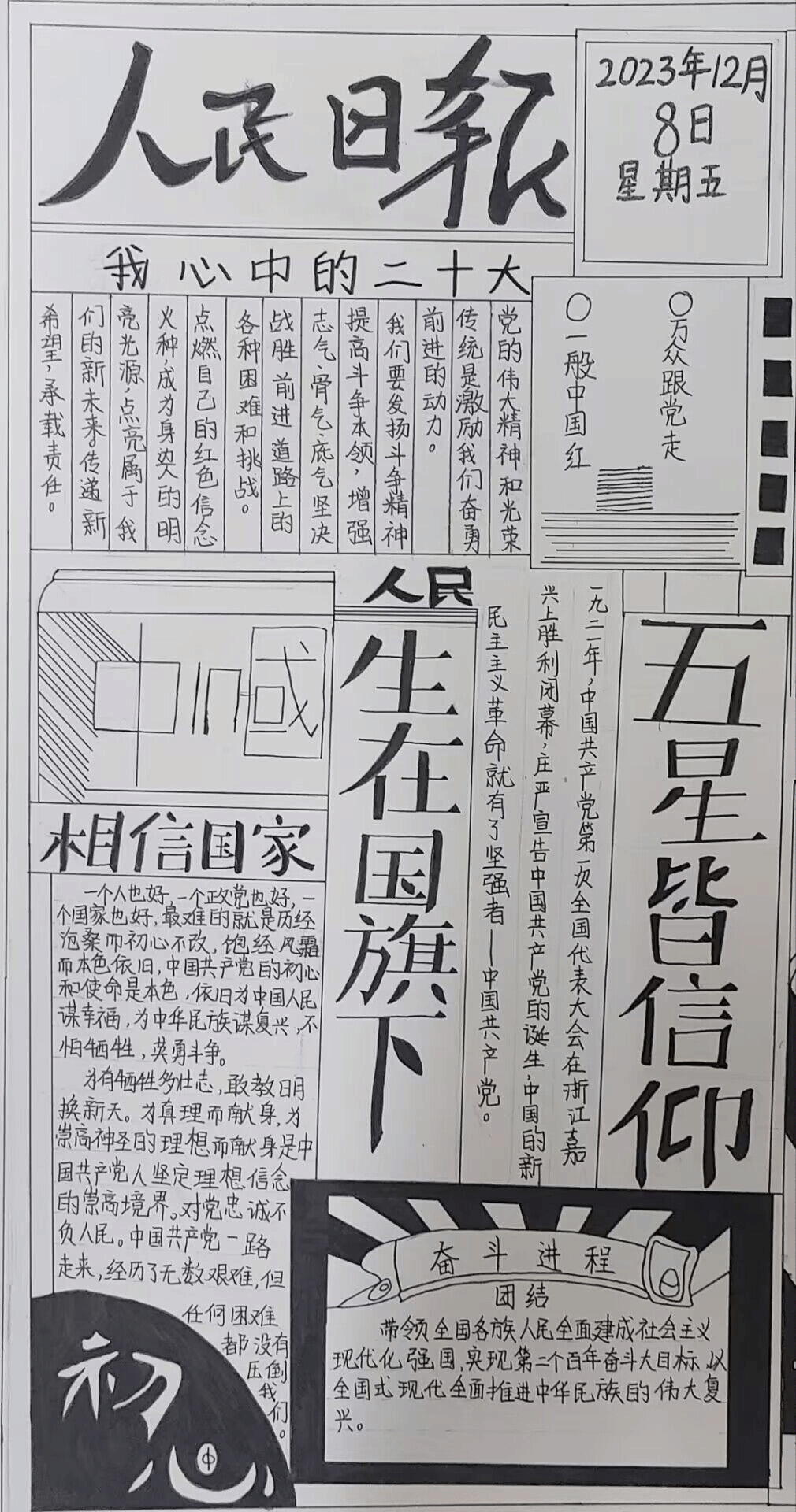 “生在国旗下,五星皆信仰”,大数据与会计231的周芋伶同学用黑白的笔墨描绘了鲜红的信念,一笔笔勾勒的不止是线条,更是她心中对国家感到的自豪。她创作时迟迟动不了笔,她想画下滔滔历史,想留住先烈英姿,但一张纸太小了,记录不下中国壮阔的历史。回望历史长河,人民选择了党,党也没有辜负人民的期望。希望我们在繁华之下也不要忘记来时的路,“不忘初心,牢记使命”,值得我们每个人铭记。