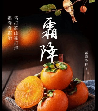 每年公历10月22-24日间,清晨的露水开始凝结成霜,草木也逐渐开始枯黄。此时正是吃柿子的好时候,南方的大闸蟹出现在餐桌上,不过这两个东西千万不能同时吃哦!农民伯伯也在田里进行收土豆、拔萝卜、收白菜等农活。