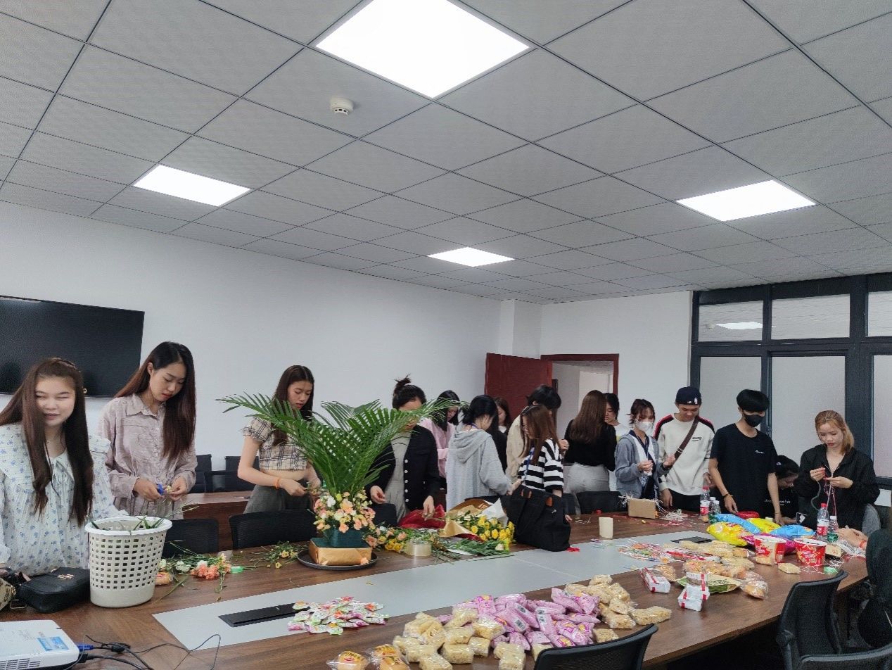 活动前中国师生们还与职工们一起做新年准备活动,插花、编手绳线等,其乐融融。